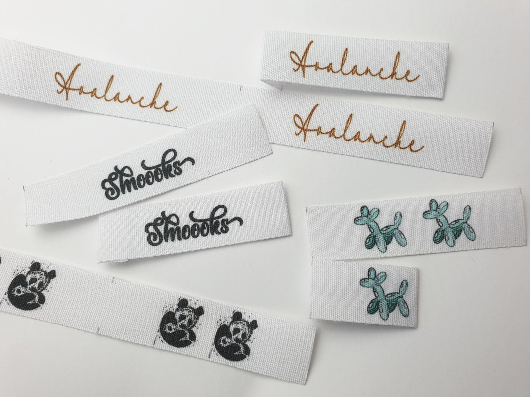 Custom printed labels with your information. These can be logo labels or combined all-in-one labels with brand/logo, care, fibre content, sizes and more.