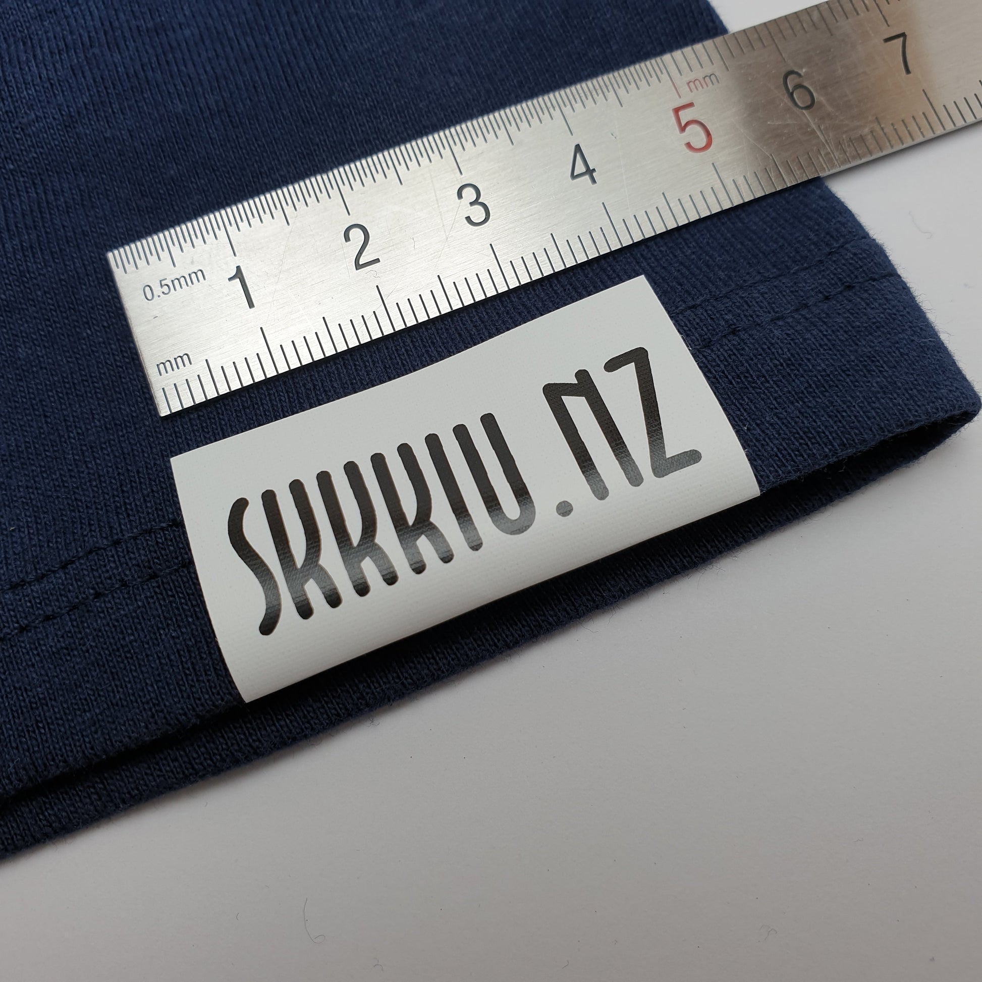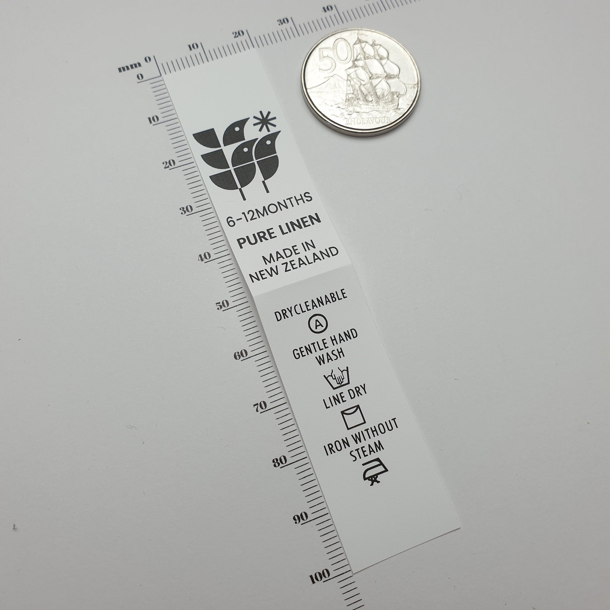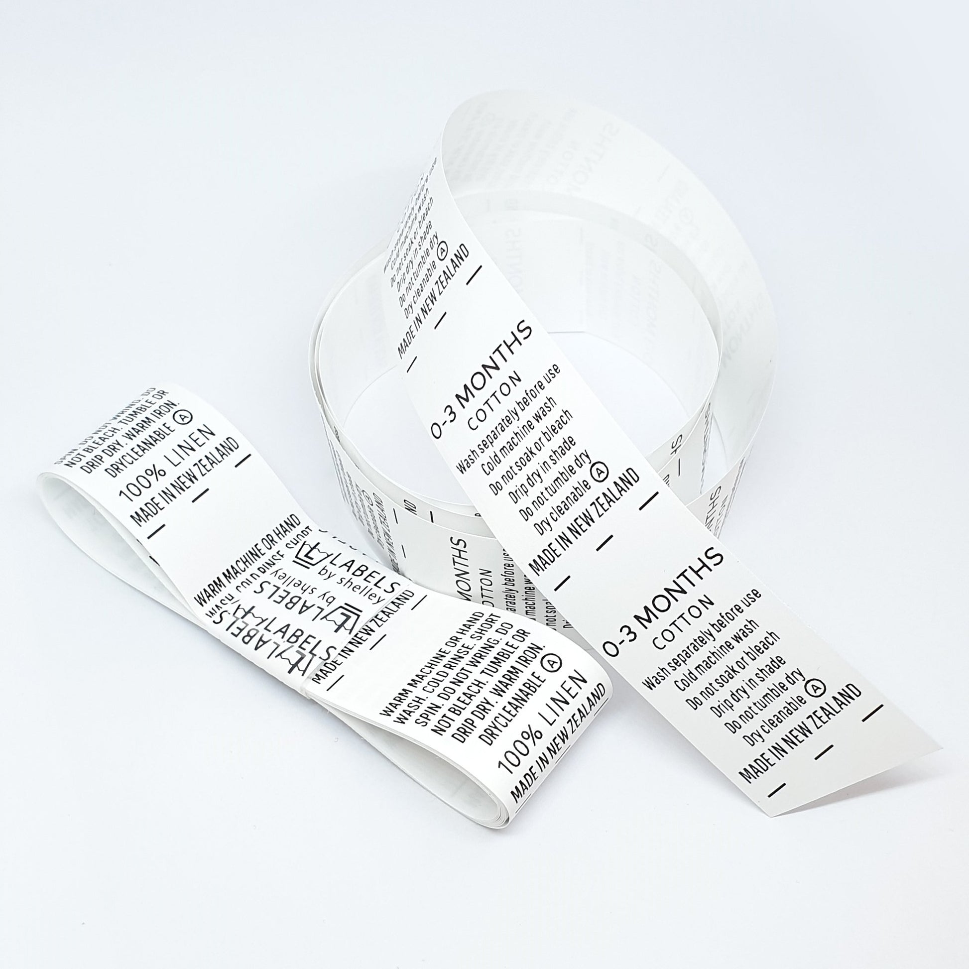 Custom printed labels with your information. These can be logo labels or combined all-in-one labels with brand/logo, care, fibre content, sizes and more.